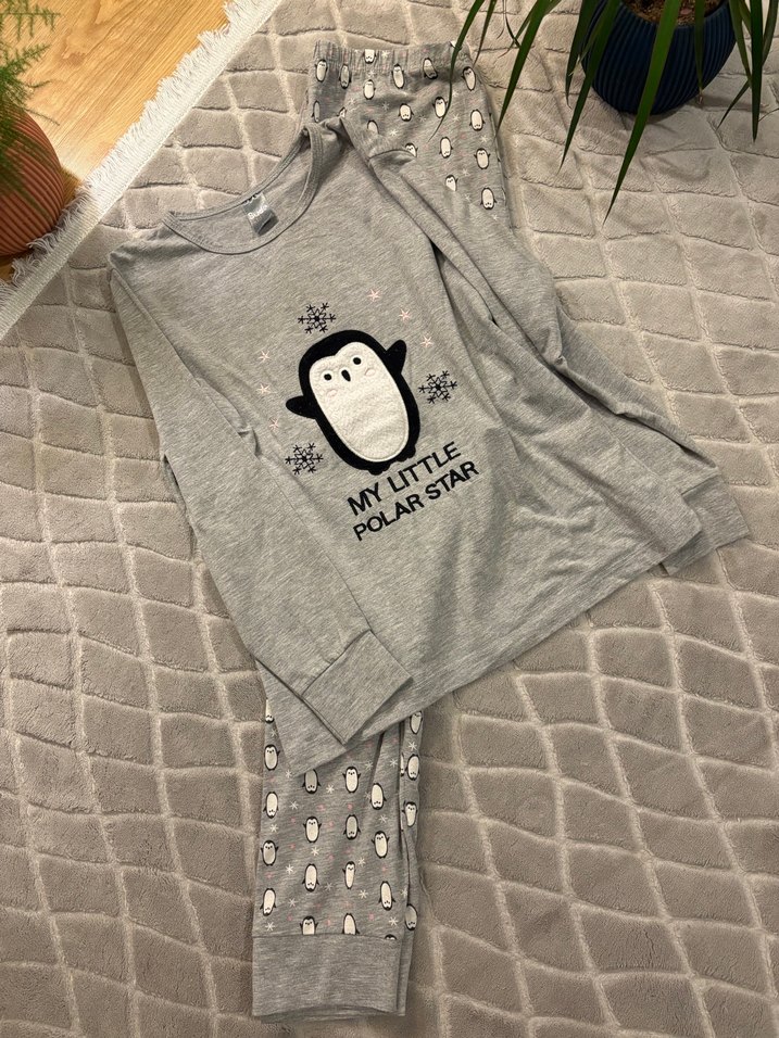 Gri renkli, uzun kollu ve yuvarlak yaka kız çocuk pijama takımı. Triko kumaş üzerinde penguen desenleri ve 'My Little Polar Star' baskısı bulunur. 12 yaş