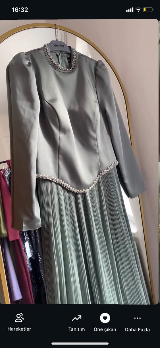 Yüksek yakalı, uzun kollu ve pilili etekli gri uzun abiye elbise. İşlemeli detaylar, düğünler için göz alıcı bir dokunuş sağlar.