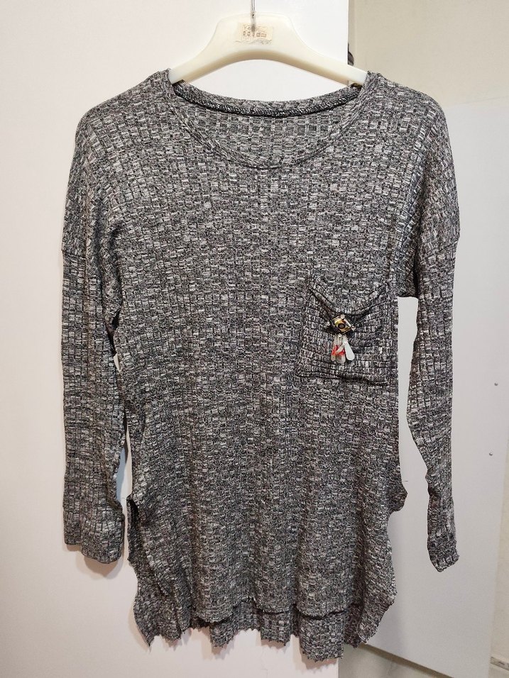 Uzun kollu, gri kazak, salaş kesim ve yuvarlak yaka detayına sahiptir. Cepte işleme detayı bulunur, günlük rahat sokak tarzına uygundur.