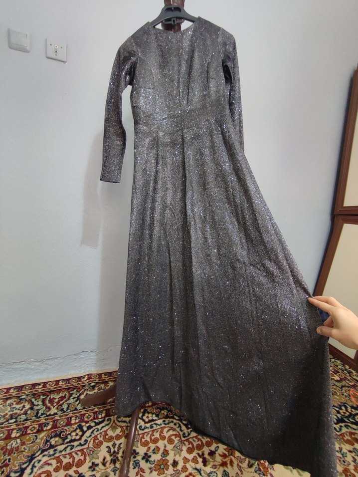 Uzun Kollu Gri Simli Abiye Elbise