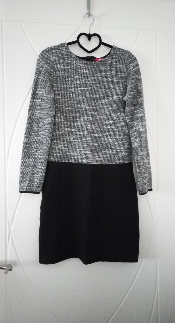 Bu dar kesim midi elbise, uzun kollu gri triko üst ve siyah etekten oluşur. Yuvarlak yaka ve minimalist çağdaş stile sahiptir, ofis için uygundur.