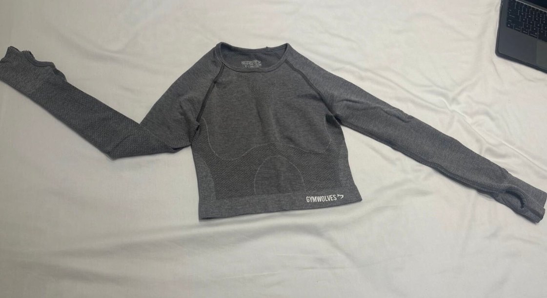 Uzun kollu, yuvarlak yakalı, gri renkli, sentetik kumaştan örülmüş, vücuda oturan crop top. 'GYMWOLVES' logosu bulunur, spor ve sokak stili için uygun. ️♀️