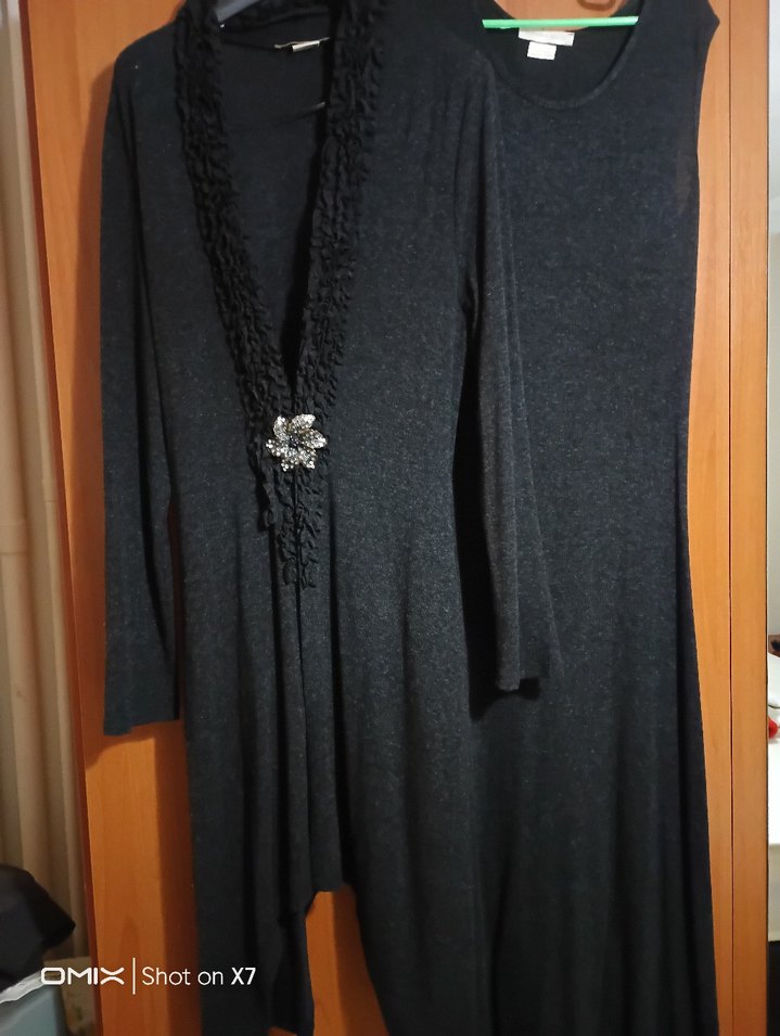 Yuvarlak yakalı, uzun kollu, gri triko elbise ve yakası kesik detaylı, drapeli uzun kollu hırka, Rahat ve trend görünüm sağlar.