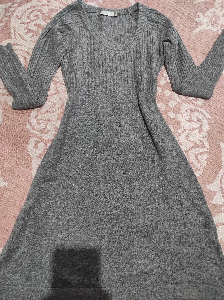 Uzun kollu ve bisiklet yaka, gri renkli, kalıplı triko elbise, günlük kullanıma uygun rahat üzerinde minik bi leke var