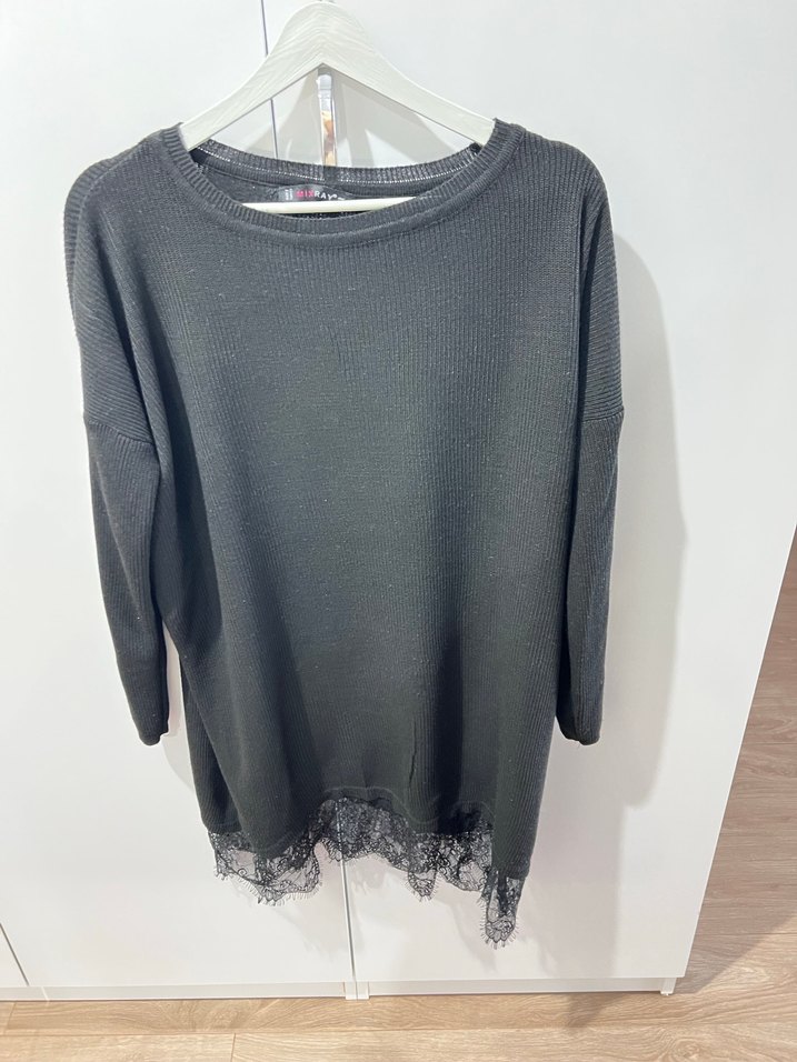 Gri renkte, uzun kollu ve yuvarlak yakalı, bol kesim kadın triko midi tunik. Alt kısmında dantel detay bulunur, rahat ve gündelik kullanıma uygundur.