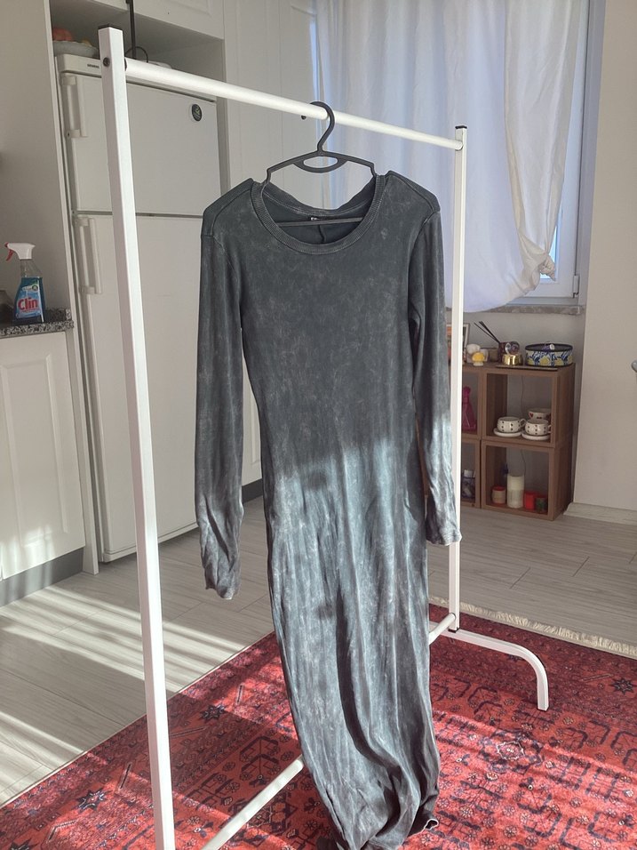 Yumuşak kumaştan, gri batik desenli, uzun kollu ve bisiklet yaka, uzun ve vücuda oturan elbise. Sokak stili için uygundur.