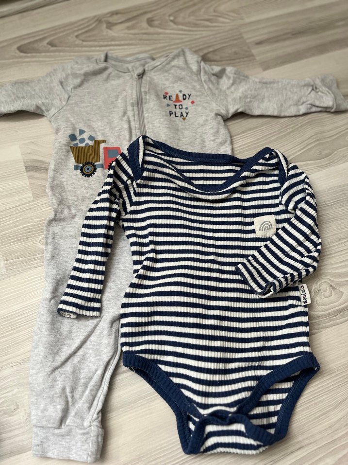 Gri fermuarlı ve baskılı, lacivert beyaz çizgili iki uzun kollu bebek body. Her ikisi de rahat pamuklu örgü kumaştan yapılmıştır.