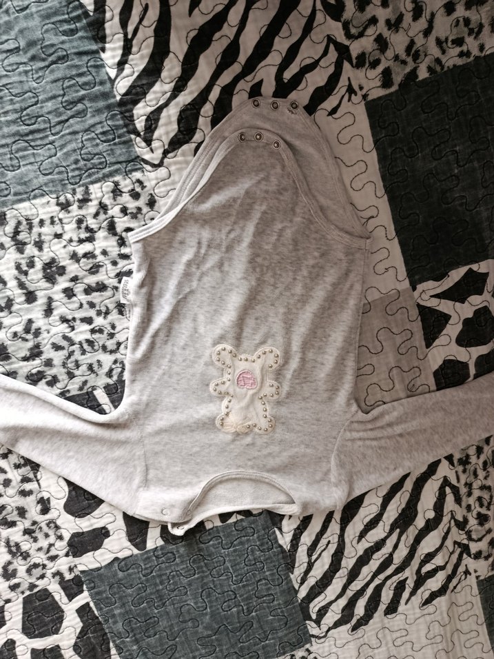 Uzun kollu, gri renkte, zebra desenli bebek body. Fırfır detaylı ve yuvarlak yakalıdır. Kolay giydirme için çıtçıt düğmeler bulunur.
