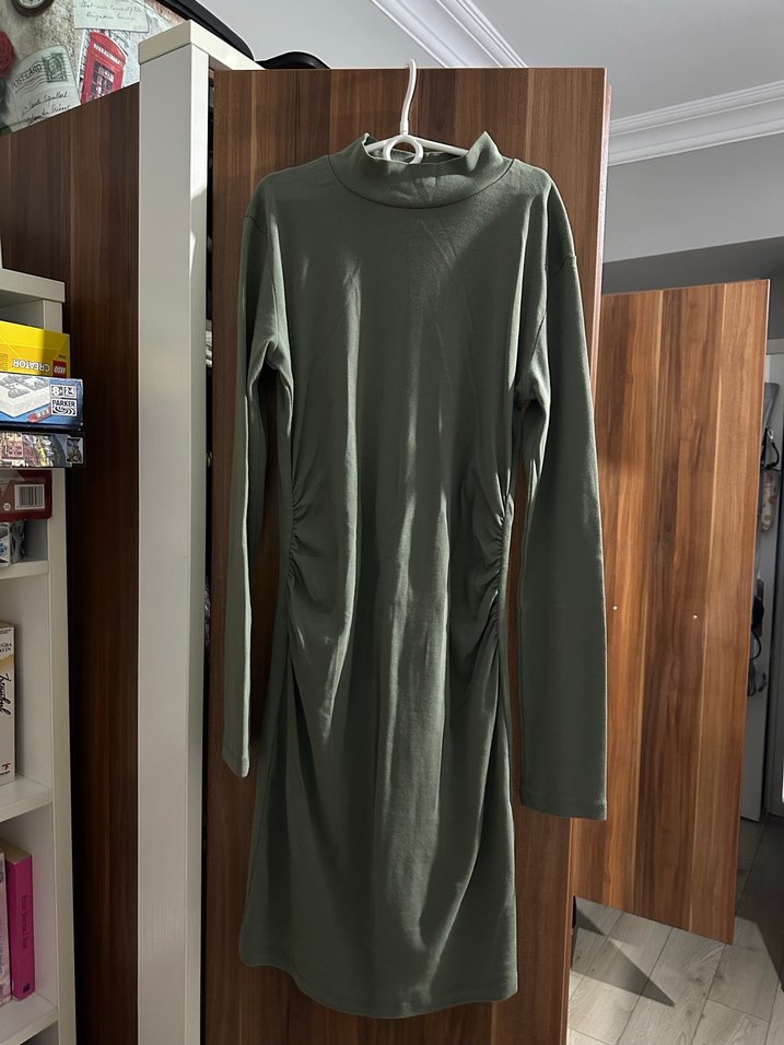 Haki renkli, uzun kollu ve bu vücuda oturan elbise, yumuşak sentetik kumaştan yapılmış ve hafif drapeli detaylara sahip. Günlük sokak stiline uygun.