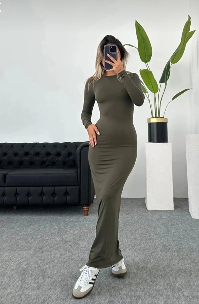 Haki renkte, uzun kollu ve bisiklet yaka, yumuşak sentetik kumaştan üretilmiş, fit kesimli uzun elbise. Minimalist ve desensiz tasarımıyla günlük kullanıma uygun. Bir kez tek giyildi