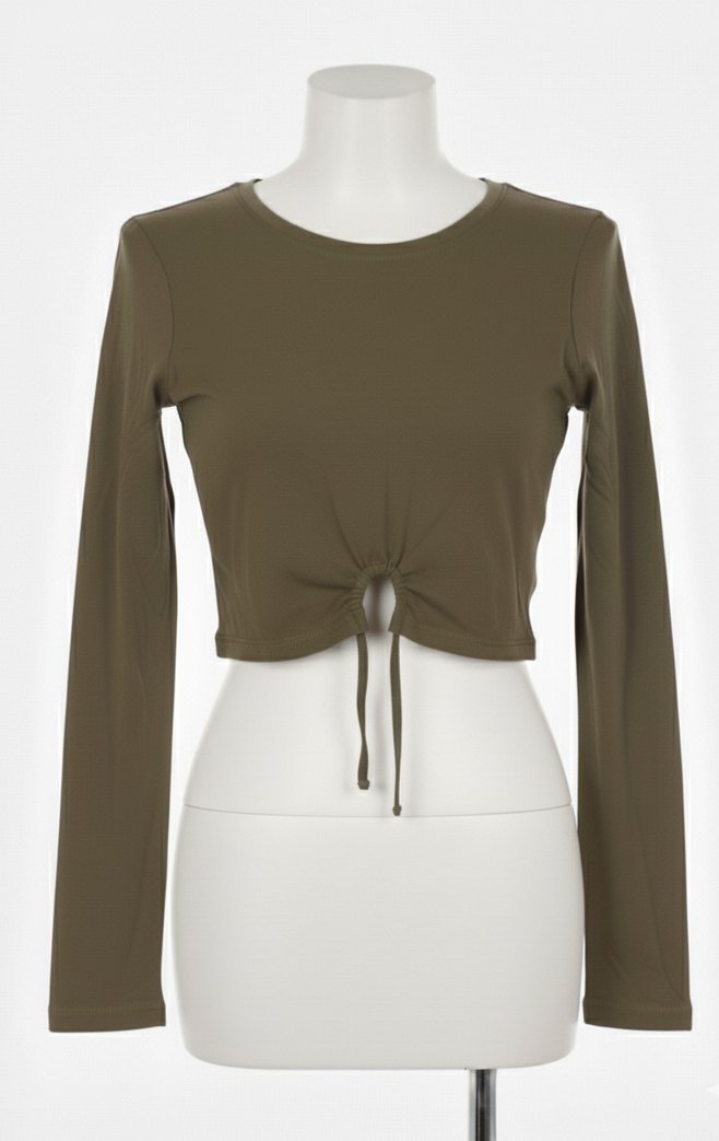 Uzun kollu, bisiklet yaka ve bel kısmında bağcık detayı bulunan, koyu hakirenkli, vücuda oturan kadın crop. Günlük kullanıma uygun, rahat ve şık bir tasarım. Ürün birkaç kez temiz kullanılmıştır, defosu yoktur.