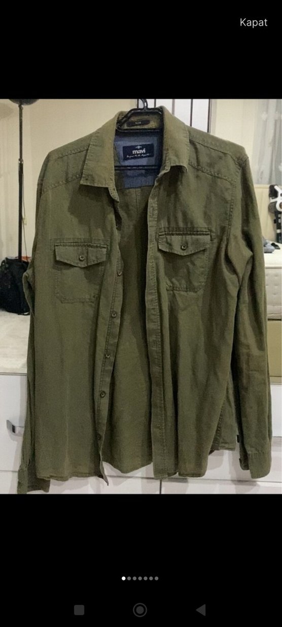 Uzun kollu, keten kumaştan yapılmış, regular fit haki erkek gömlek. keten ve düğmeli önü ile iki göğüs cebi bulunur.