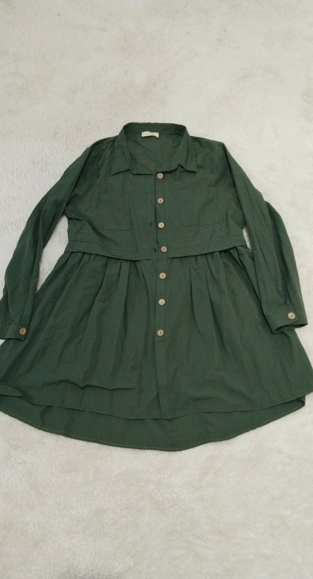 Uzun kollu, yakalı ve düğmeli koyu haki gömlek.Yumuşak keten kumaştan, bol kesim ve uzun boyda, günlük rahat kullanım için uygundur.