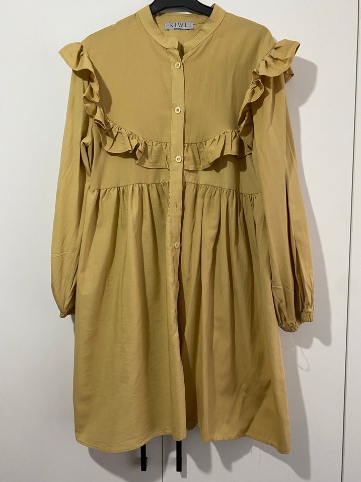 Uzun kollu, hardal , pamuk kumaştan yapılmış, bol kesim ve fırfır detaylı bohem tarzı tunik. Yüksek yakalı ve günlük kullanıma uygun. hiç giyilmedi