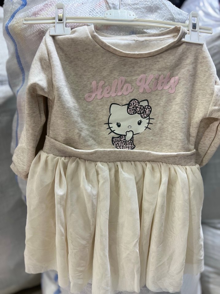 Uzun kollu, bisiklet yaka ve pastel bej renkte, fitted kesim kız elbisesi. Üzerinde Hello Kitty baskısı ve fırfırlı etek detayı bulunur.
