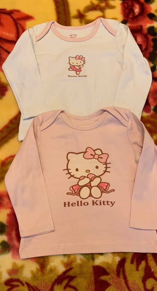 Uzun kollu, yuvarlak yaka, düğmeli 2 adet bebek body. Pastel pembe ve beyaz renklerde, üzerlerinde Hello Kitty baskısı bulunur.