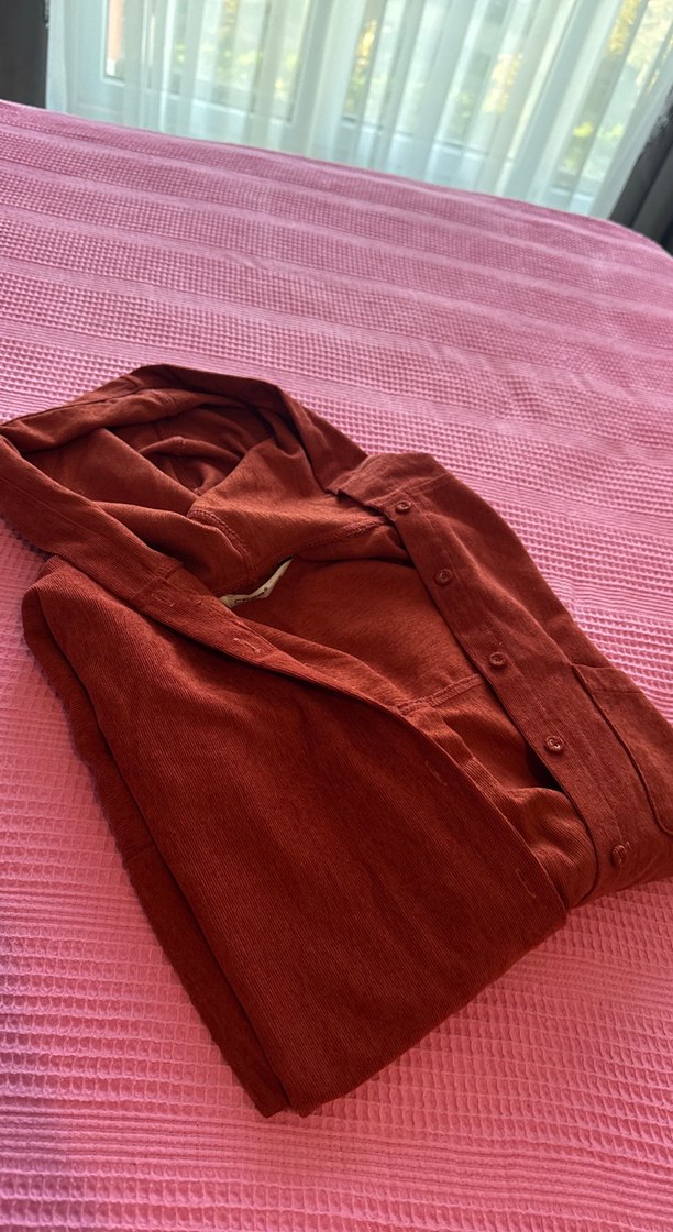 Kiremit rengi, uzun kollu ve notched lapel yakalı bol kesim hemşire sabahlığı. Uzun boyda ve desensiz, koyu renkte tasarlanmıştır.