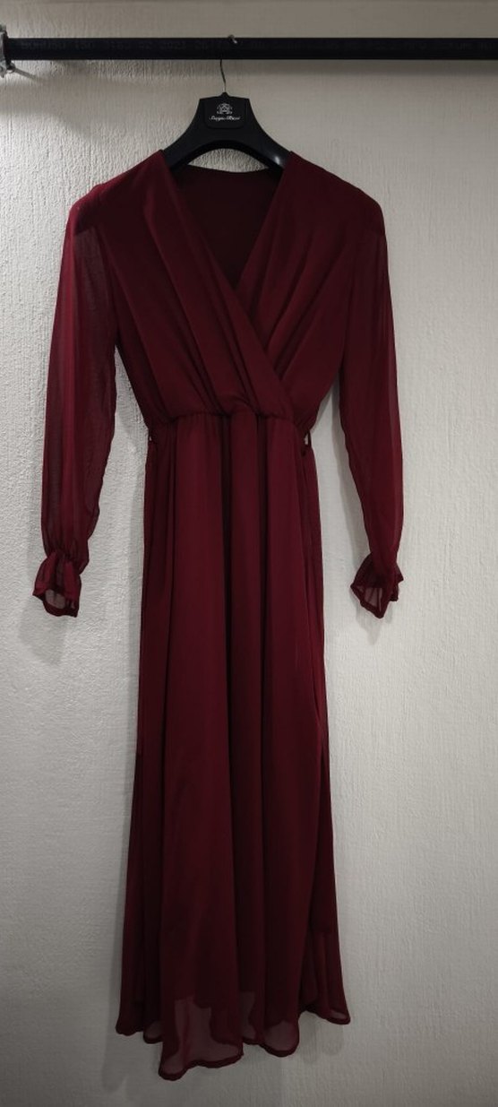 Bordo rengi astarlı uçuş uçuş kuşaklı elbise