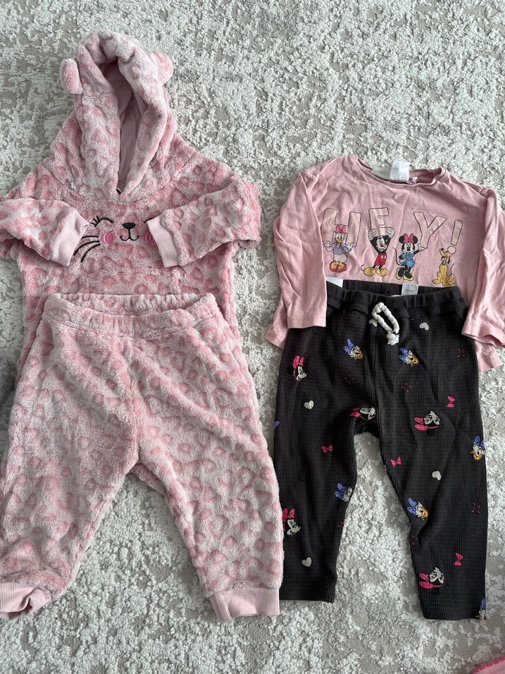 Koyu pembe renkli, uzun kollu, hayvan yüzü detaylı örme kapüşonlu üst ve pantolon ile nakışlı karakterli pembe uzun kollu tişört ve baskılı siyah pantolondan oluşan kız bebek kıyafet seti.