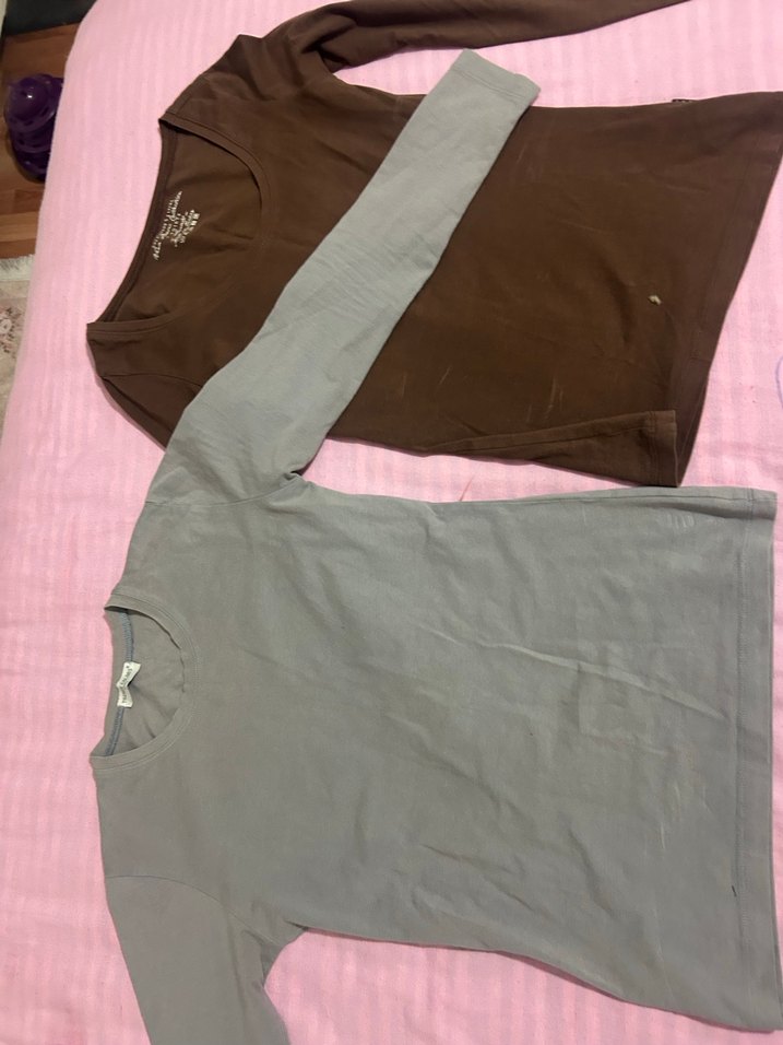 Pamuk kumaştan, uzun kollu ve bisiklet yakalı tişörtler. Kahverengi ve gri renk.