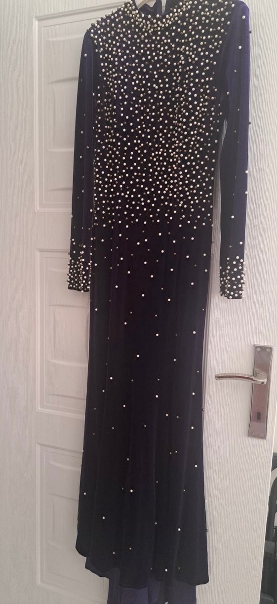 Uzun kollu, kadife,inci işlemeli mürdüm abiye elbise, şık ve klasik bir görünüm sunar. Hafif kuyruğu bulunmaktadır. Tesettür giyim için uygundur. ✨