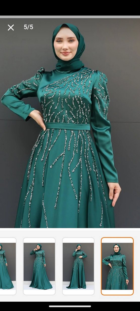 Uzun kollu, yüksek yakalı yesil abiye boncuk işlemeleriyle süslenmiş, mütevazı ve modern kesime sahiptir. terzi islemi görmüştür