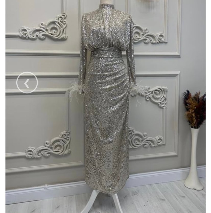 Yüksek yakalı ve uzun kollu, işlemeli uzun abiye elbise. Drapeli tasarımı ve regular fit kesimiyle modern klasik stil sunar, düğünler için uygun. ✨