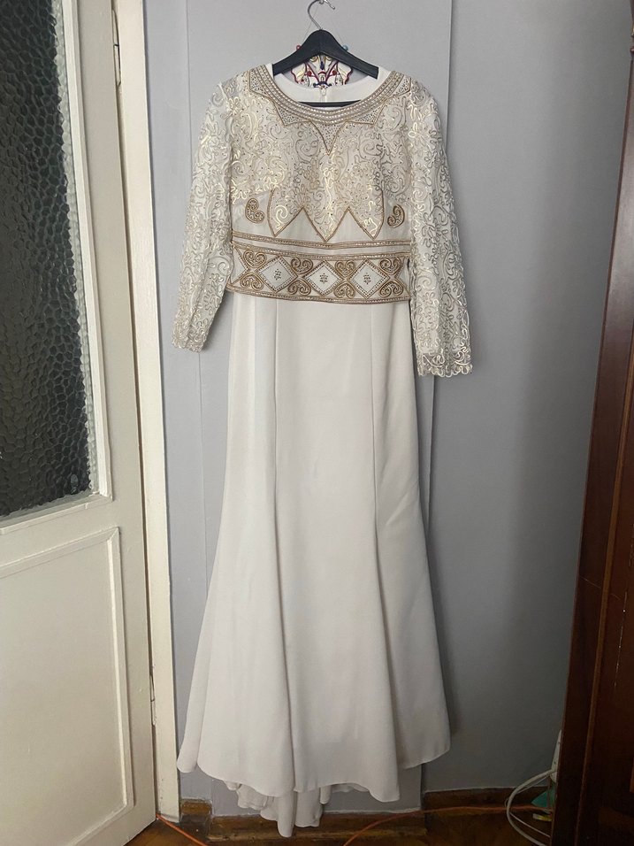 Uzun kollu, tekne yaka ve işlemeli beyaz Abiye elbisesi. Drapeli tasarımıyla modern klasik ve vintage dokunuş sunar, rahat regular fit ile düğünlere uygun. İki parçalı