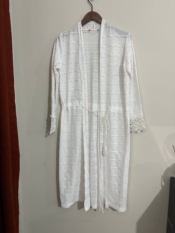 Uzun beyaz kadın sabahlık, işlemeli detaylar ve dantel manşetli uzun kollara sahiptir. Gevşek kesim ve minimalist bohem tarzda, bel bağlama ipi içerir.