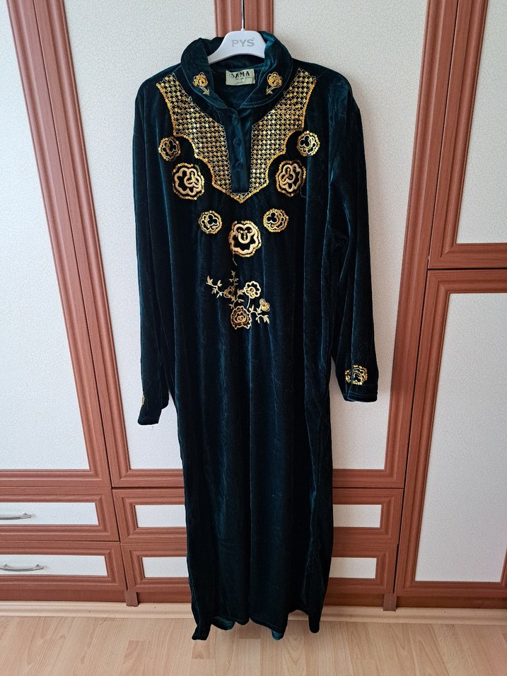 Kullanılmadı. 58 beden ustune olur. Uzun, bol kesim elbise, yüksek yakalı ve uzun kolludur. Koyu yeşil kadife kumaş üzerinde altın işlemeler ve boncuk detayları vardır, bohem tarzını yansıtır.