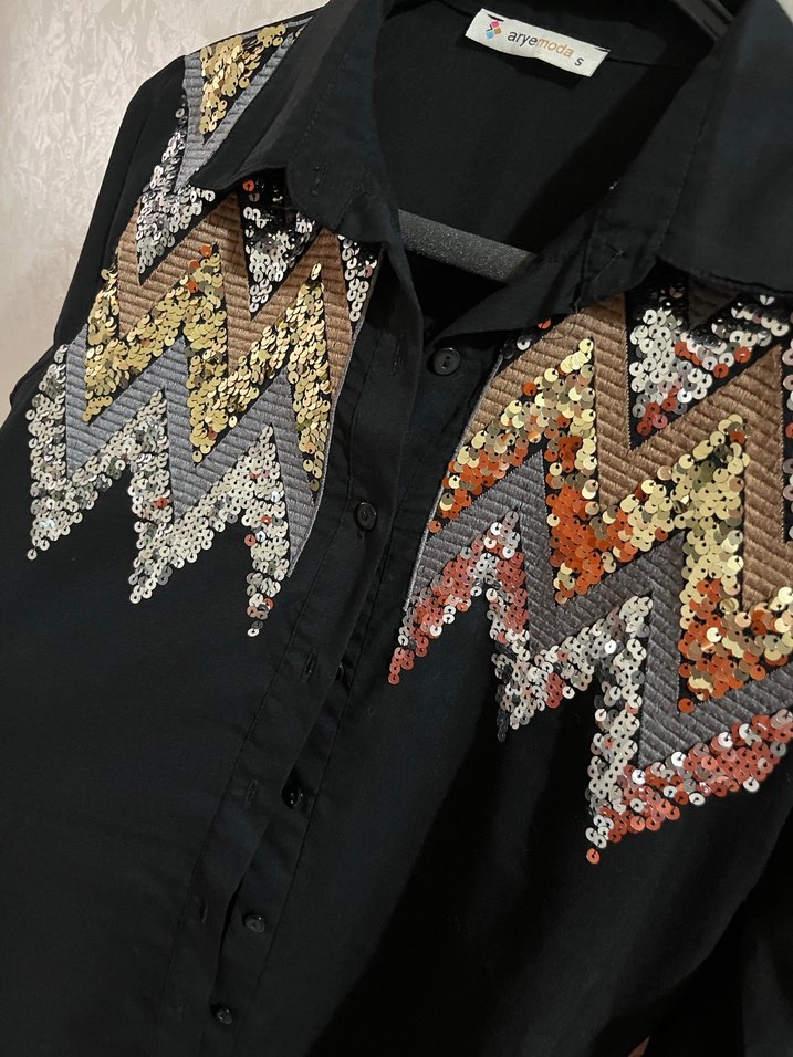 V yaka, düğmeli, işlemeli payet desenli uzun kollu, bohem tarzda kadın gömleği. Parti için uygun, dar kesim ve çok renkli detaylar içerir. ✨