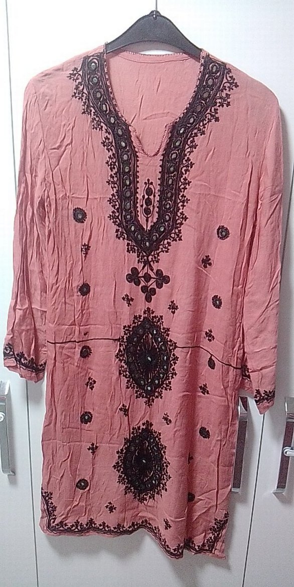 SIFIR ÜRÜN HİÇ KULLANILMAMIŞ Uzun, bol kesim tunik; V yaka Narçiçeği renk, KETEN ŞİLE BEZİ kumaş, işlemeli ve boncuklu detaylara sahip, günlük kullanıma uygun. Deniz kıyısında giy, Hamile bayanlar,ada olur,M/L/XL BDN LERE UYAR,BOYDAN,TUNİK MODELİ ELBİSE