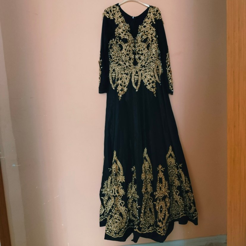 Bu uzun abiye, koyu renkte kumaş üzerinde detaylı gold işlemelere sahip, uzun kollu, dökümlü bol kesim ve V yakalıdır, düğünler için uygundur.