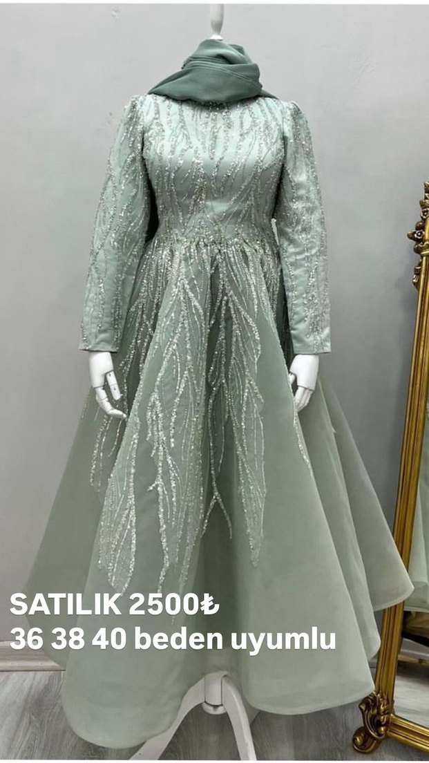 Uzun kollu, işlemeli ve boncuk detaylı gri abiye elbise. Tekne yaka ve regular fit kesime sahiptir. 36, 38, 40 bedenlere uyumludur. 2500₺ satılık