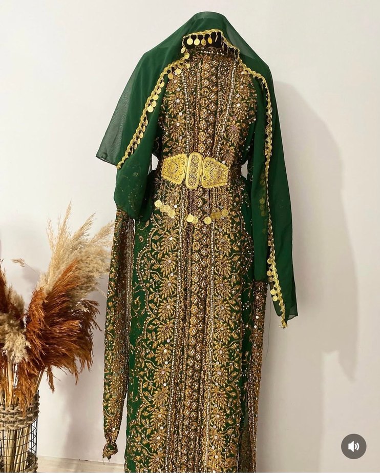 Uzun, koyu yeşil kınası elbise, altın işlemeler ve boncuk detaylarıyla süslenmiştir. Yüksek yakalı, uzun kollu ve normal kesimdir, altın kemerle tamamlanmıştır.