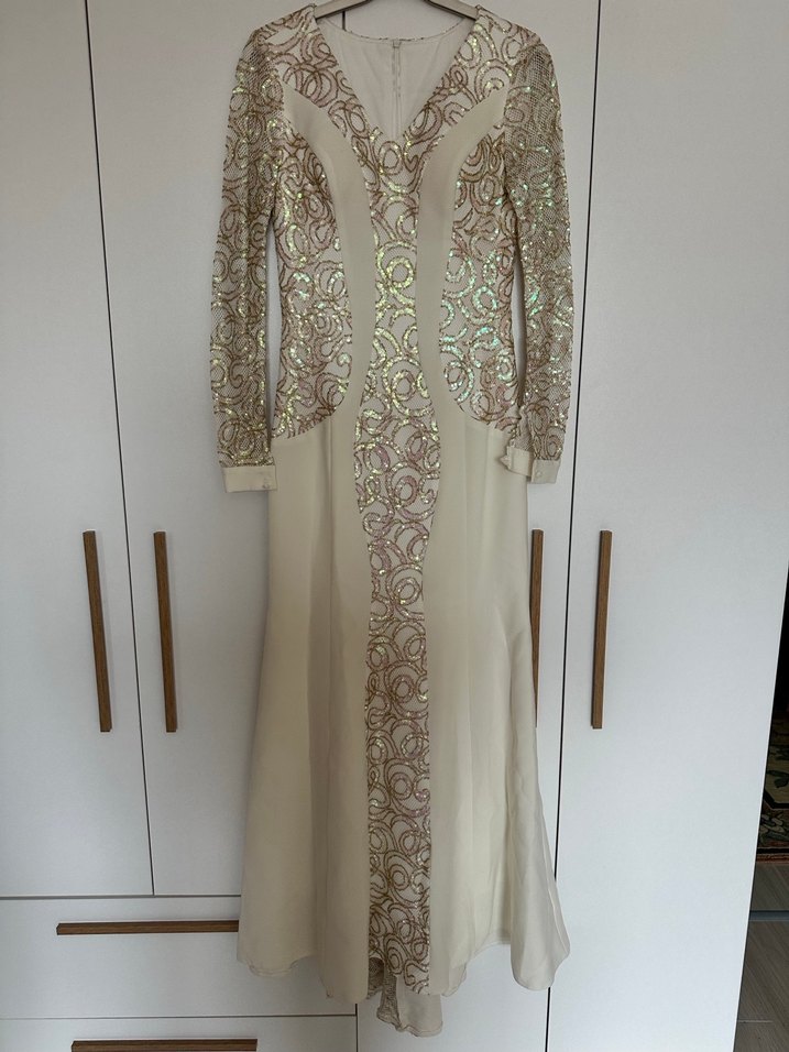 V yaka ve uzun kollu, işlemeli desenlere sahip uzun krem abiye elbise. Düzenli kesim ve drapeli tasarım, vintage ve modern klasik stil karışımı, düğünler için uygun. 1 kere giyildi