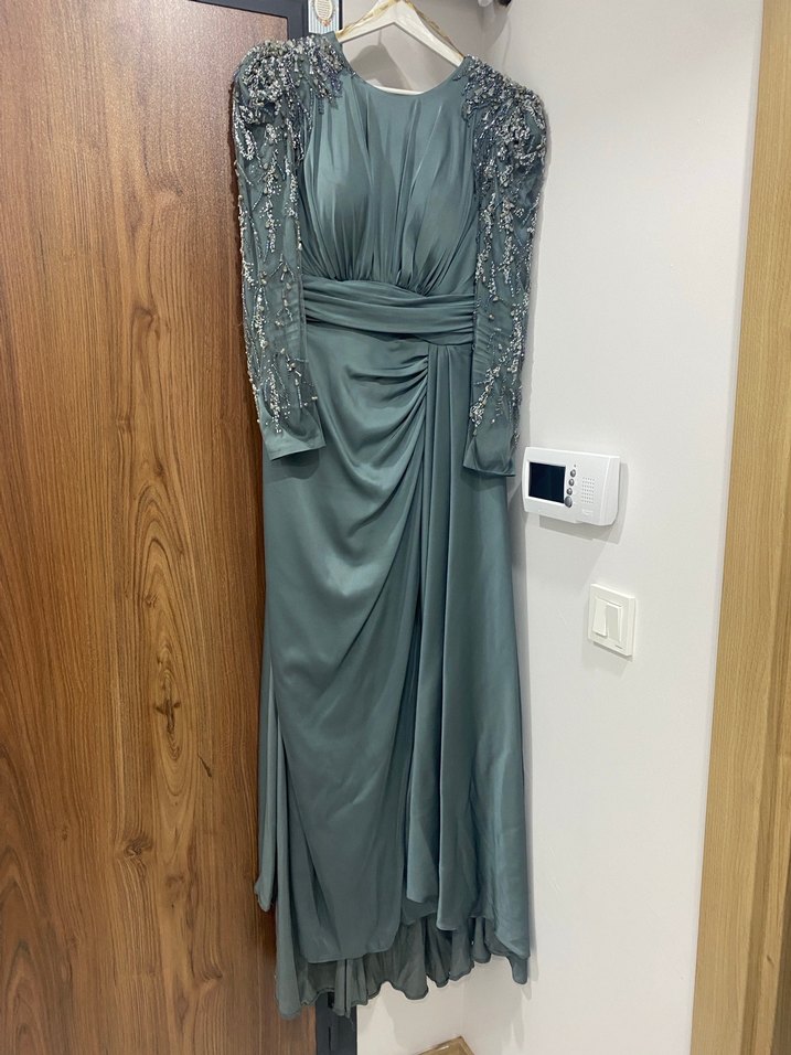 Uzun Kollu İşlemeli küf yeşili Kadın Abiye Elbise