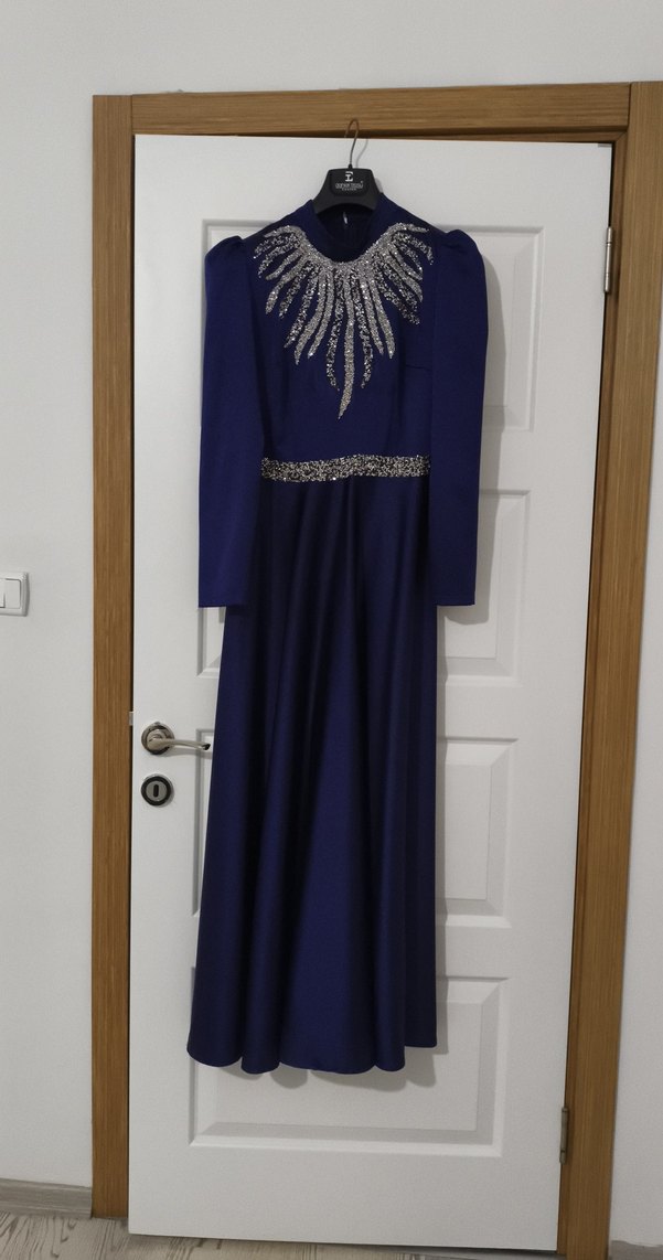 Uzun kollu ve yüksek yakalı, lacivert abiye elbise. Yakası ve beli işlemeli ve boncuk detaylı, klasik ve şık bir görünüm sunar.
