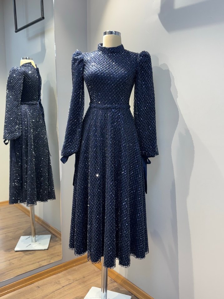 Lacivert uzun abiye elbise, yüksek yakalı ve uzun kolludur. Parlak boncuk işlemeleriyle modern klasik bir tarz sunar, düğünler için uygundur. arkası biritli olduğu için 40 bedende olabilir ✨