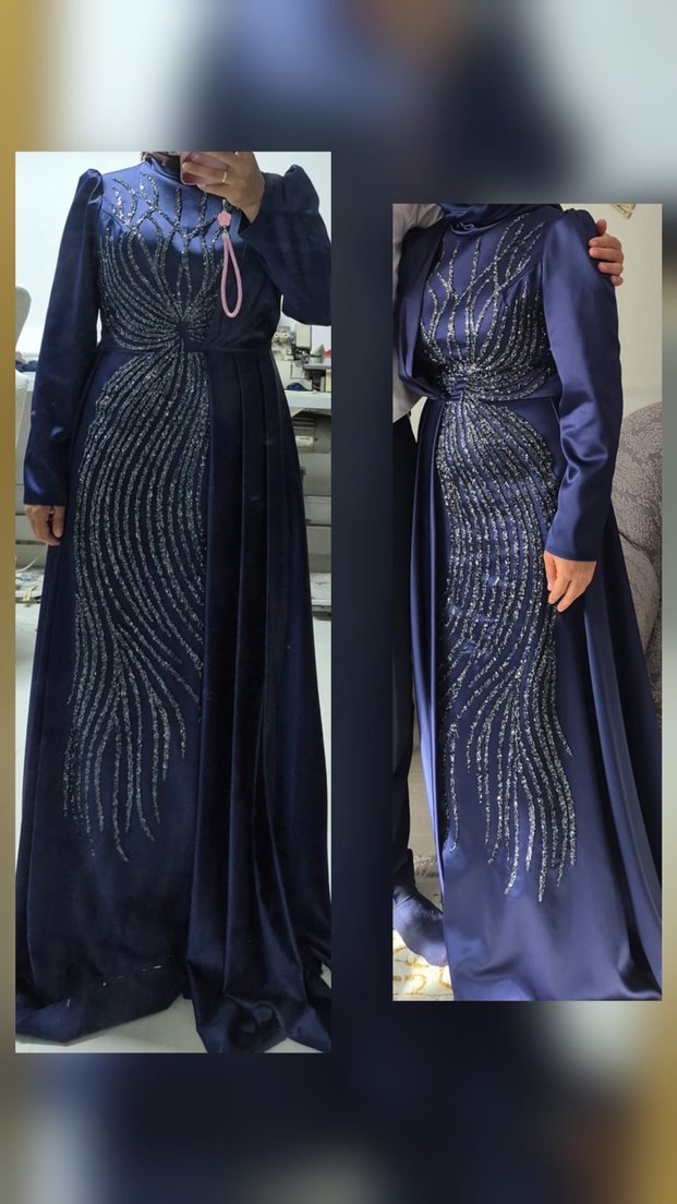 Yüksek yakalı, uzun kollu, işlemeli ve drapeli detaylara sahip uzun mavi abiye elbise. Parlak dokusu ve klasik kesimiyle düğünler için uygun. ✨
