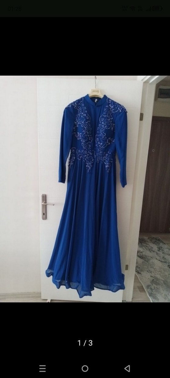 Uzun Kollu İşlemeli Mavi Abiye Elbise