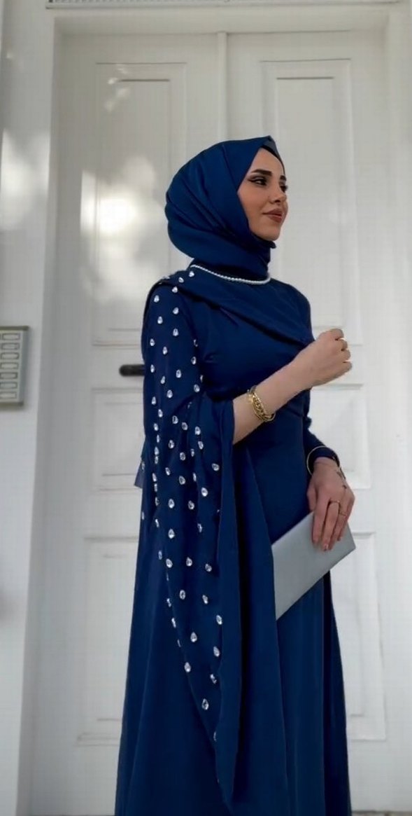 Uzun Kollu İşlemeli Mavi Abiye Elbise