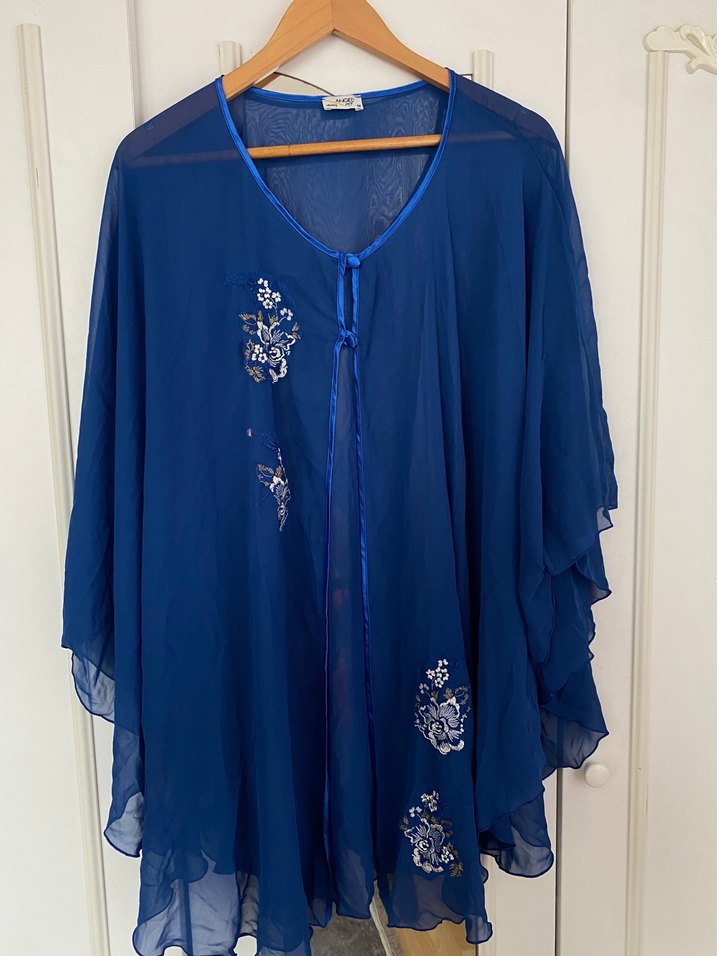Uzun kollu, bol kesim, parlak mavi kumaş üzerine işlemeli çiçek detaylarıyla bohem tarzda kadın elbisesi.