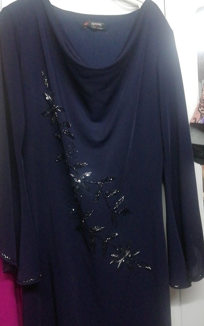 Uzun kollu, yüksek yakalı ve işlemeli desenlere sahip, satenimsi kumaştan yapılmış mavi hamile tuniği. Drapeli detaylar ve şık kesimiyle parti için uygun.