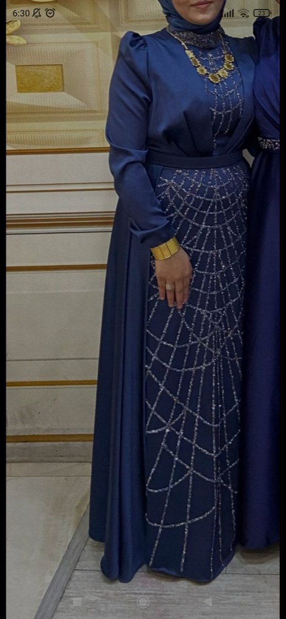 Uzun Kollu İşlemeli Mavi Kadın Abiye Elbise