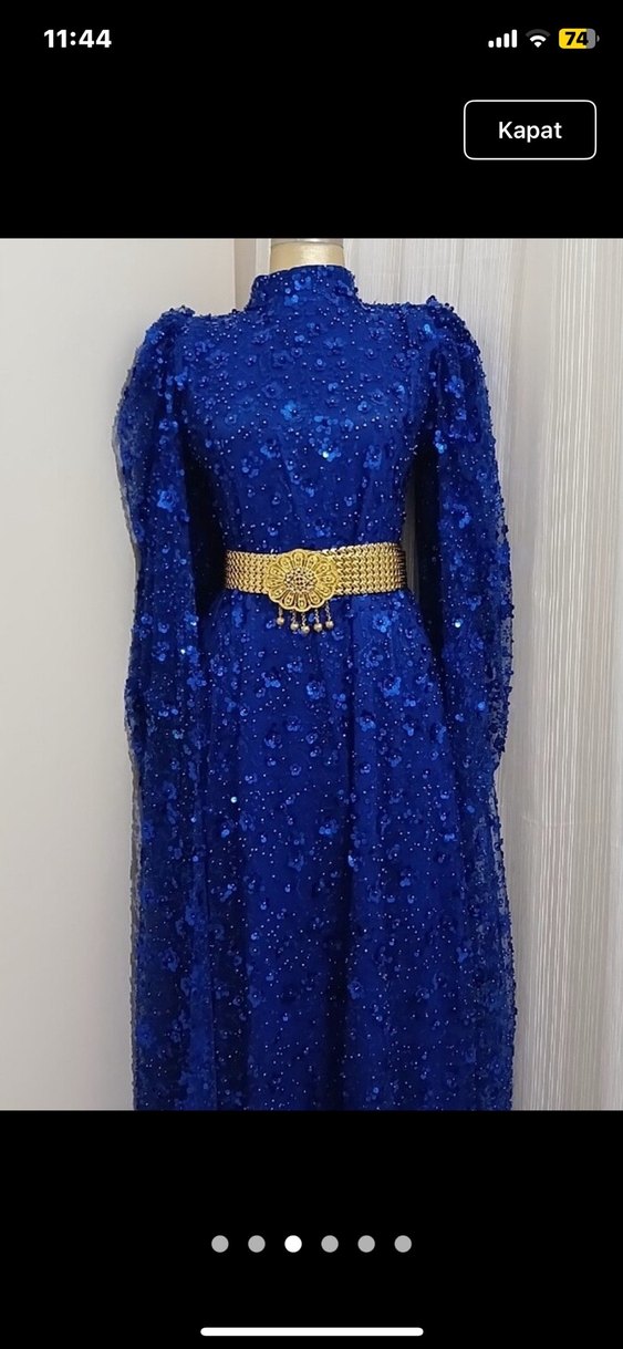 Uzun kollu, yüksek yakalı kadın abiye, parlak mavi kumaş üzerinde işlemeli ve boncuk detaylıdır. Altın kemerle süslenmiş, düğünler için uygundur.