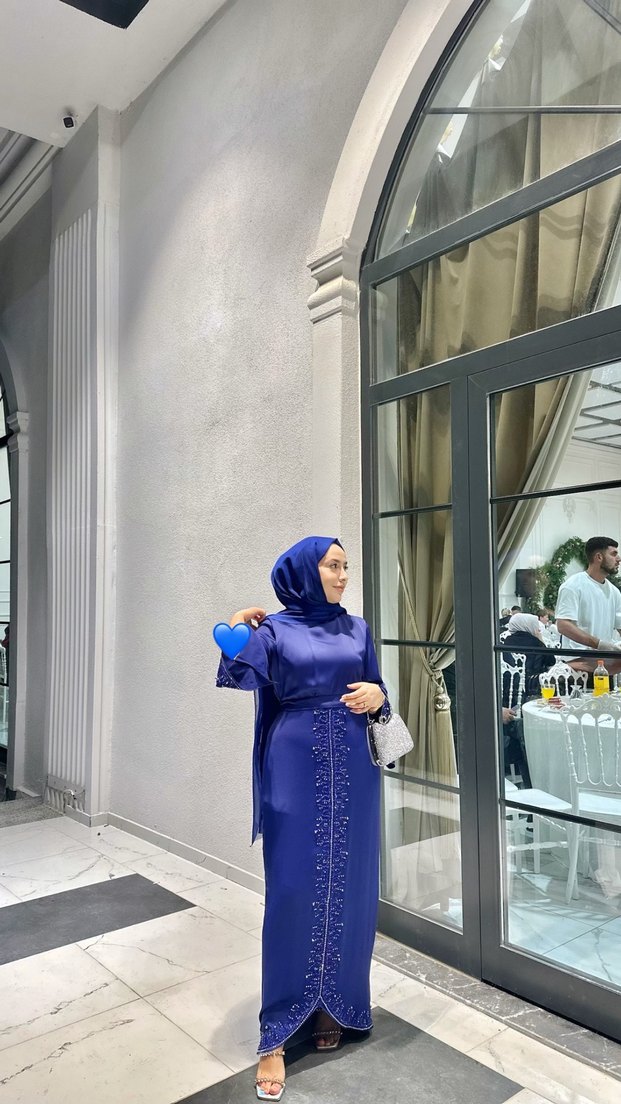 Uzun Kollu İşlemeli Mavi Kadın Elbisesi