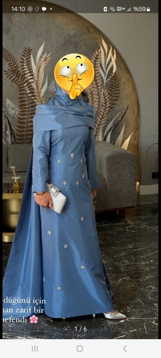 Uzun Kollu, İşlemeli Mavi tesettur Straplez detaylı Abiye Elbise