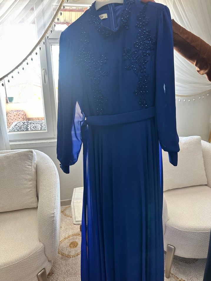 Uzun kollu, yüksek yakalı ve işlemeli detaylara sahip mavi uzun abiye elbise. Düzenli kesim ve drapeli tasarımıyla düğün ve özel davetler için uygundur.