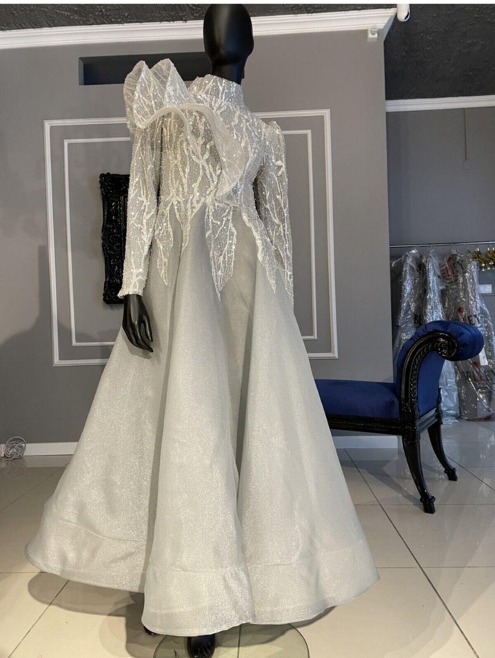 Uzun boy, yüksek yakalı ve uzun kollu abiye, işlemeli detaylarla modern klasik tarzda, gri tonlarında düğün söz nişan elbisesi.